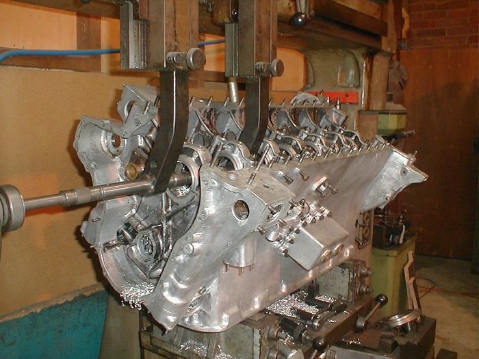 A Rolls-Royce V12 on the line-boring machine at EMS